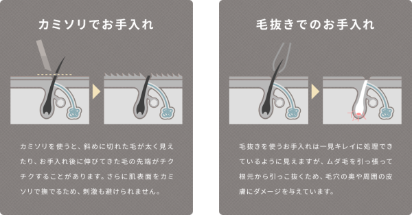 実際、自宅でカミソリや毛抜き、脱毛ワックスや脱毛テープなどでのムダ毛の自己処理は、一見キレイになったように感じますが、目に見えない刺激が蓄積された状態でかなりのお肌に大きなタメージを与えています。