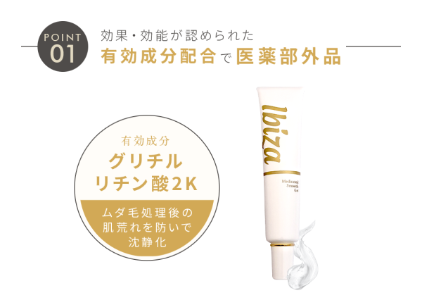 薬用イビサスムースジェルに含まれる有効成分「グリチルリチン酸2K」は厚生労働省に認めらえた成分として肌荒れを防ぎ沈静化してくれます。
