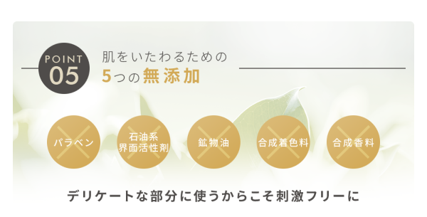 デリケートゾーンは皮膚が薄いため、繊細な刺激の少ないやさしいオーガニック成分で作られた専用製品での正しいケアが大切です。